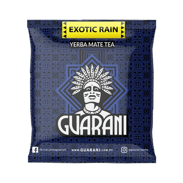 • Guarani Exotic Rain er en energigivende paraguayansk yerba mate med en intens, tropisk smag af mango, papaya, ananas og appelsin. Den energigivende kraft fra Ilex paraguariensis og den frugtagtige friskhed vil føre dig til et eksotisk paradis!