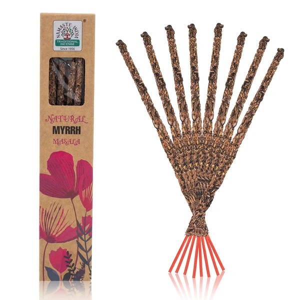 - Namaste India Myrrh - naturlige røgelsespinde med en varm, harpiksagtig myrraduft. Håndlavet i Indien af naturlige ingredienser. Perfekt til afslapning, meditation og til at skabe en rolig atmosfære i hjemmet.