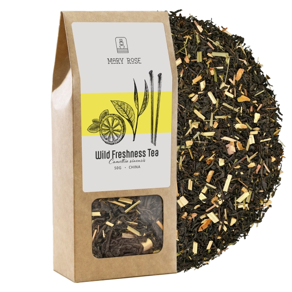 Mary Rose Wild Freshness er en forfriskende fusion af sort assam-te af højeste kvalitet og naturlige ingredienser. Blandt dem finder vi citronskal og citrongræs. Den syrlige smag af citrongræs med en let bitter note af citronskal skaber en perfekt kombination med sort te. På grund af de anvendte tilsætningsstoffer vil Mary Rose Wild Freshness være fremragende både varm og i form af en afkølet drik. Vi kan varmt anbefale den!