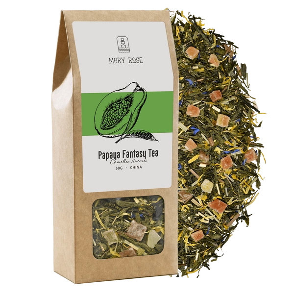 - Mary Rose Papaya Fantasy er en blanding baseret på sencha grøn te og perfekt udvalgte urter og frugttilsætninger. Den kandiserede papaya skiller sig især ud her, da den introducerer en aromatisk note af sødme til sammensætningen.