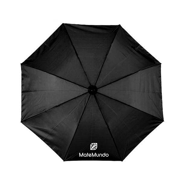 - Sammenklappelig sort paraply med MateMundo-butikkens logo.