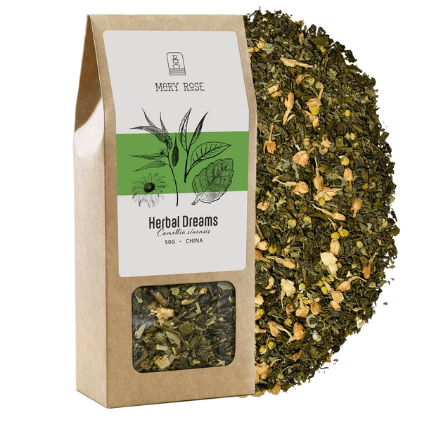 Basen i Mary Rose Herbal Dreams-te er grøn gunpowder-te, perfekt blandet med urtetilsætninger: citronmelisse, kamille, jasmin og blade af eukalyptus og basilikum. Urternes karakteristiske smag suppleres af naturlige aromaer. På trods af rigdommen af så mange forskellige tilsætningsstoffer danner helheden en ekstremt sammenhængende, harmonisk komposition.